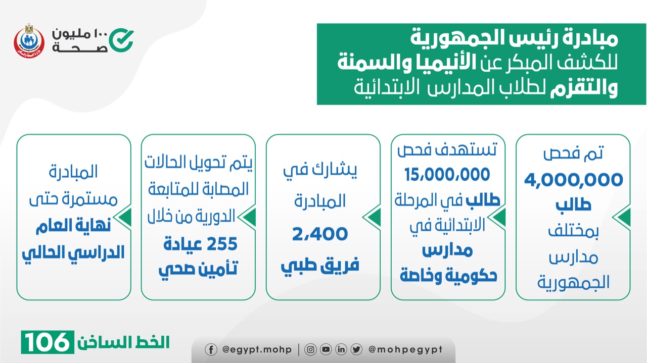 أكدت الوزارة أنه تم فحص 4 مليون طالب بمختلف مدراس الجمهورية، وذلك من أصل 15 مليون طالب تستهدفهم الوزارة.