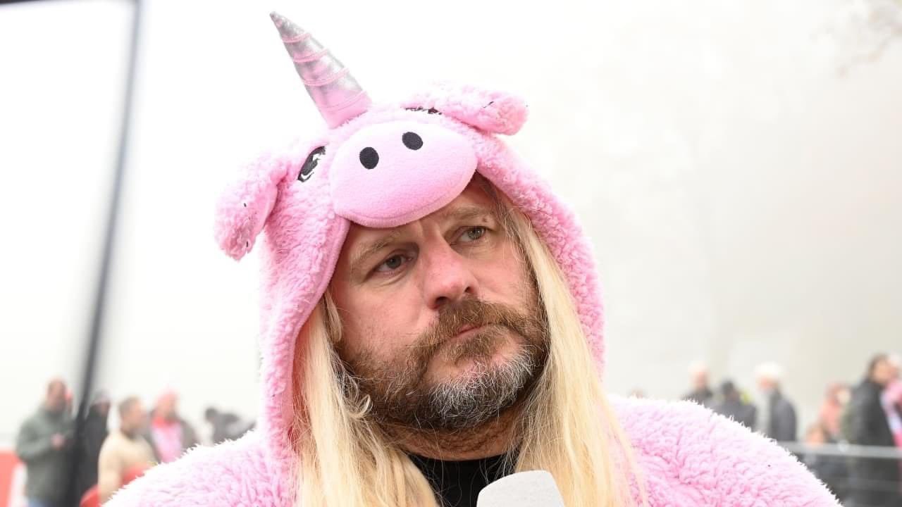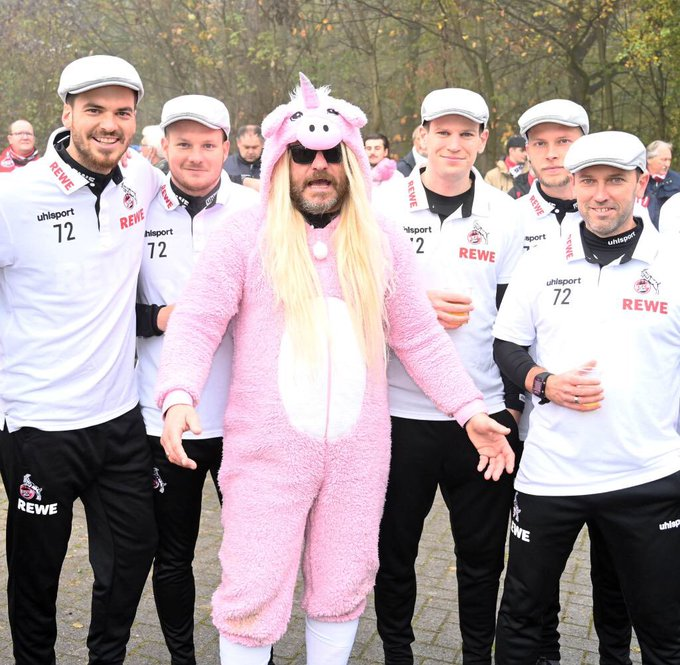 وذهب المدير الفني لفريق كولن الألماني، إلى الحصة التدريبية لفريقه مرتديا زي وحيد القرن، مع انطلاق موسم الاحتفالات في مدينة كولونيا.