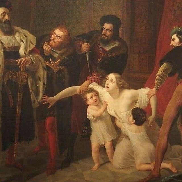 وتظهر اللوحة، النبلاء وهم يحملون السكاكين، فيما تعلو وجههم نظرات شريرة، ويستعدون لقتل أنيسيا بعدما تلقوا الإشارة من الملك الذي ينظر ببرود لتوسلات الضحية ونشيج أطفالها.