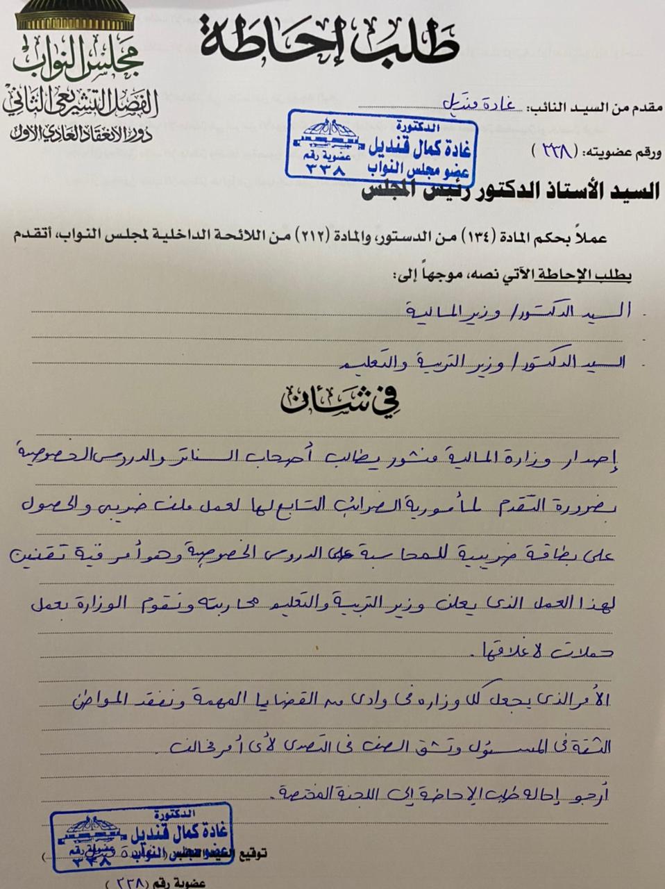 وتقدمت الدكتورة غادة قنديل عضو مجلس النواب بطلب إحاطة لدكتور حنفي الجبالي رئيس مجلس النواب وموجه إلى وزيري المالية والتربية والتعليم بشأن تعاملهما مع ملف الدروس الخصوصية، حيث أكدت النائبة غادة قنديل في طلب الإحاطة على أن تلك التعاملات في الوزارتين تدل على عدم التنسيق وأن كلا منهما يعمل في وادي بعيد عن الأخر.