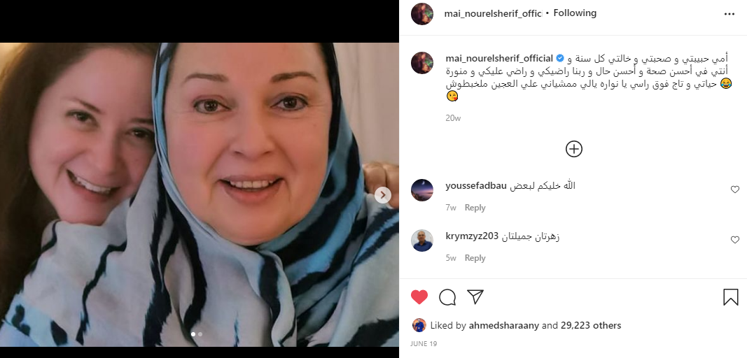 شاركت الفنانة مي نور الشريف جمهورها، بصورة لها مع شقيقة والدتها، الفنانة الكبيرة نورا، وذلك عبر حسابها الشخصي بموقع تبادل الصور والفيديوهات القصيرة إنستجرام.