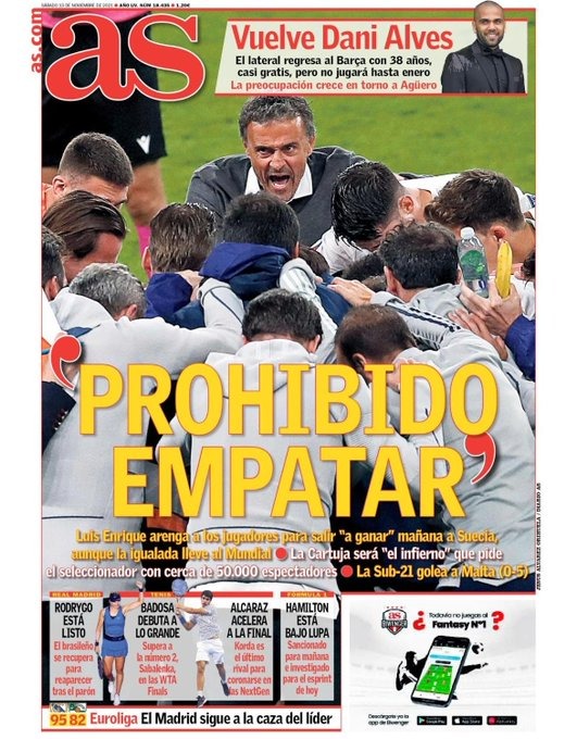 سلطت صحيفة آس الإسبانية الضوء على اجتماع إنريكي مع لاعبي إسبانيا، وذلك تحت عنوان ممنوع التعادل، في جلسة أخيرة شهدت تعليمات المدرب للاعبيه.