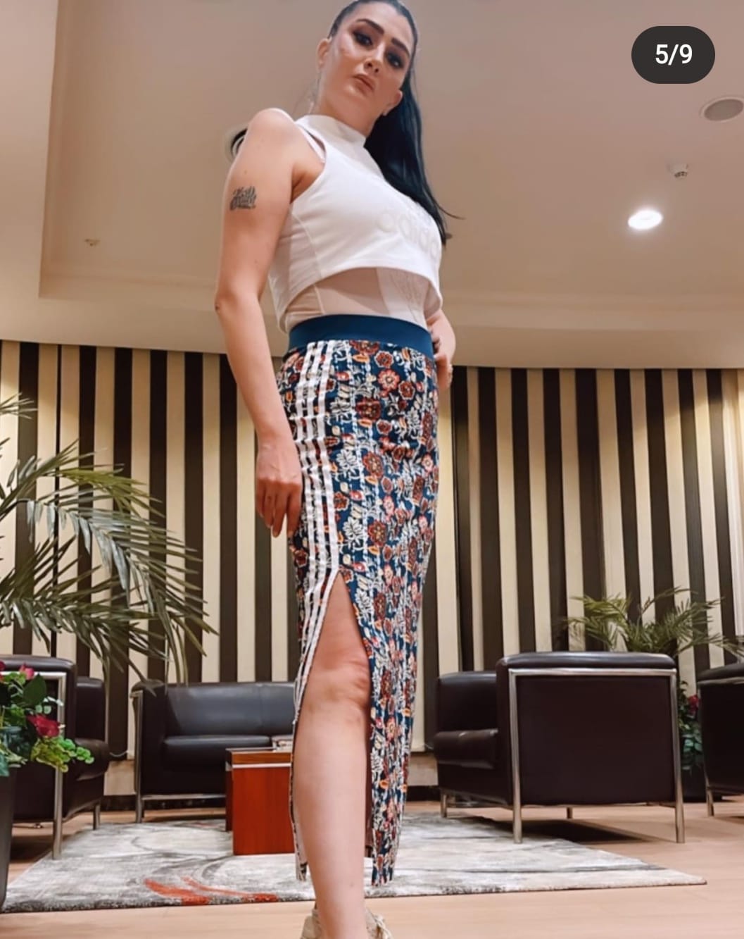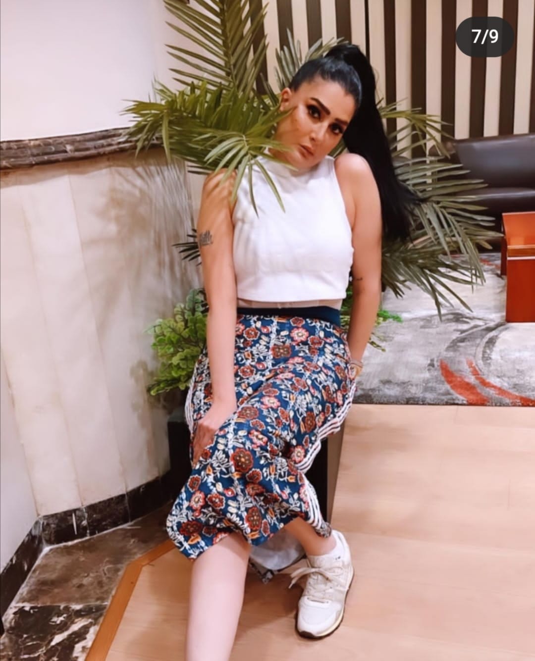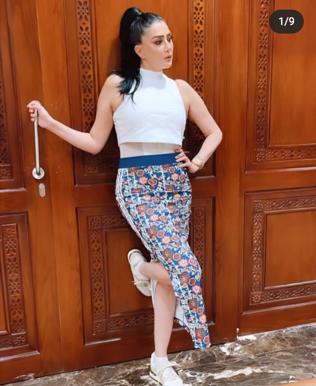 ونشرت الفنانة غادة عبد الرازق الصورة، عبر حسابها الشخصي على موقع تبادل الصور والفيديوهات القصيرة انستجرام، وظهرت غادة في الصور، مرتديةً تنورة زرقاء منقوشة، وعليها هاي كول باللون الأبيض.