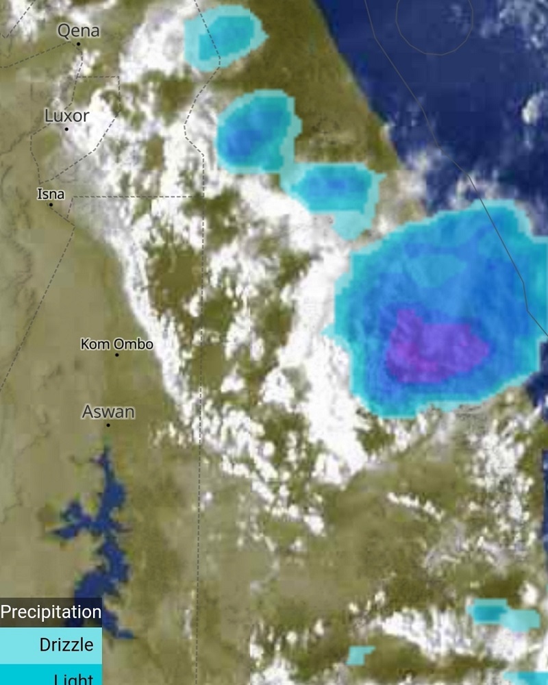 أشار خبراء الأرصاد إلى أن هناك أمطارا خفيفة على مناطق من السواحل الغربية وأقصى جنوب الصعيد في مدن ومحافظات السلوم، ومطروح، وأسوان، وأبو سمبل على فترات متقطعة بنسبة 30% تقريبا.