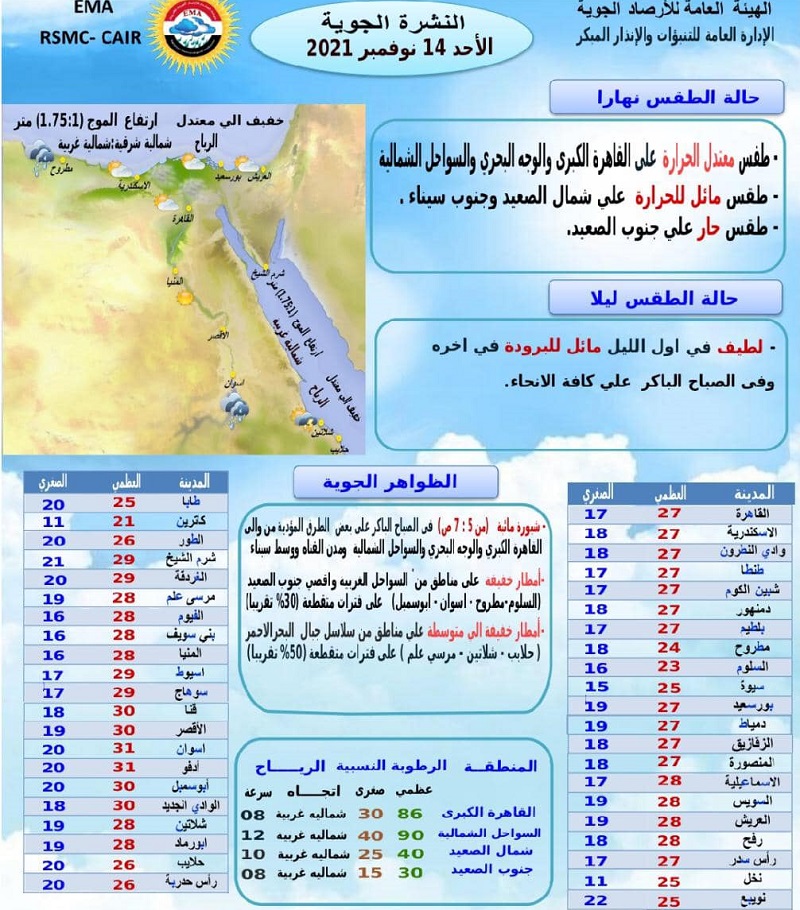 الأرصاد تحذر.. ننشر حالة الطقس ودرجات الحرارة غدا الأحد 14-11-2021 في مصر
