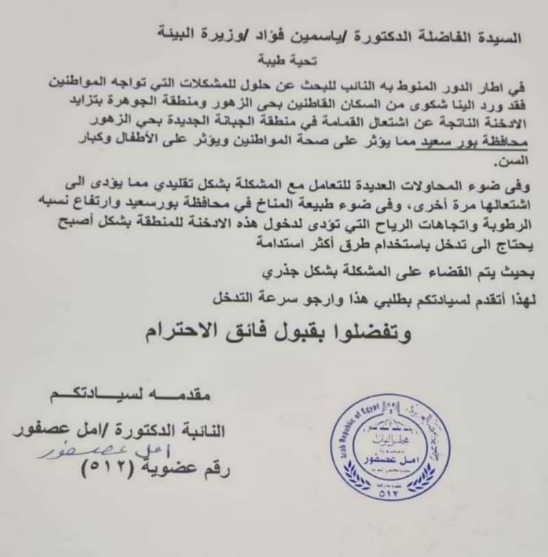 برلمانية تتقدم بطلب لوزيرة البيئة لحل مشكلة الأدخنة الناجمة عن حرق القمامة بحي الزهور ببورسعيد | مستند
