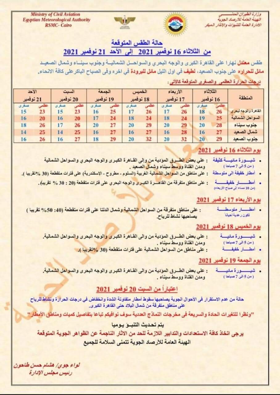 اعتبارًا من السبت المقبل تتكون حالة من عدم الاستقرار في الأحوال الجوية يصاحبها سقوط أمطار متفاوتة الشدة وانخفاض في درجات الحرارة، وكذلك نشاط للرياح على مناطق متفرقة من شمال البلاد حتى القاهرة الكبرى.