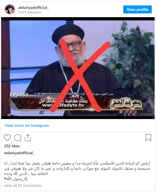 وقامت الفنانة عايدة رياض، بنشر صورة عبر حسابها الرسمي بموقع تبادل الصور والفيديوهات انستجرام، مُهاجمة الكاهن زكريا بطرس المسئ للإسلام، قائلة: أرفض أي إساءة للدين الإسلامي فأنا أحترمه جدا ولا يوجد شيء يمكن أن يفرق بيننا، مضيفة: أنا مسيحية وأحتفل بالمولد النبوي مع جيراني دائما، الدين لله وحده... إلا رسول الله.