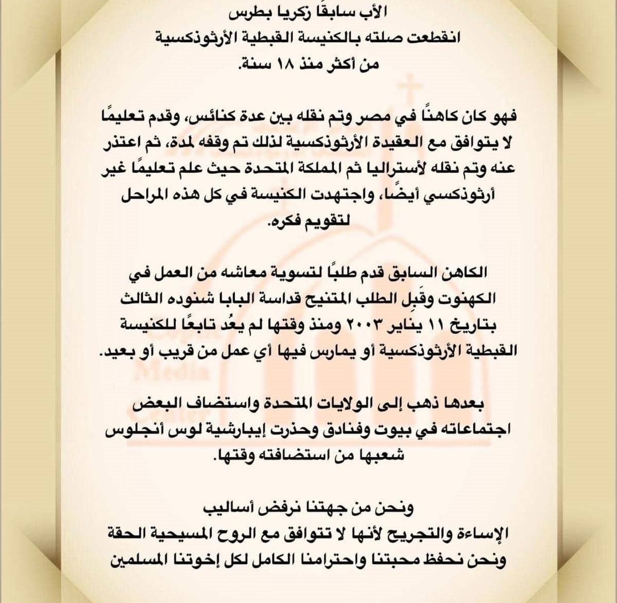 ومن جانبها، ردت الكنيسة القبطية الأرثوذكسية على تصريحات الكاهن زكريا بطرس المسيئة للدين الإسلامي، من خلال بيان رسمي لها نشرته مساء أمس السبت، مُعلنة من خلاله انقطاع صلته بها منذ فترة تتعدى الـ18 عامًا.