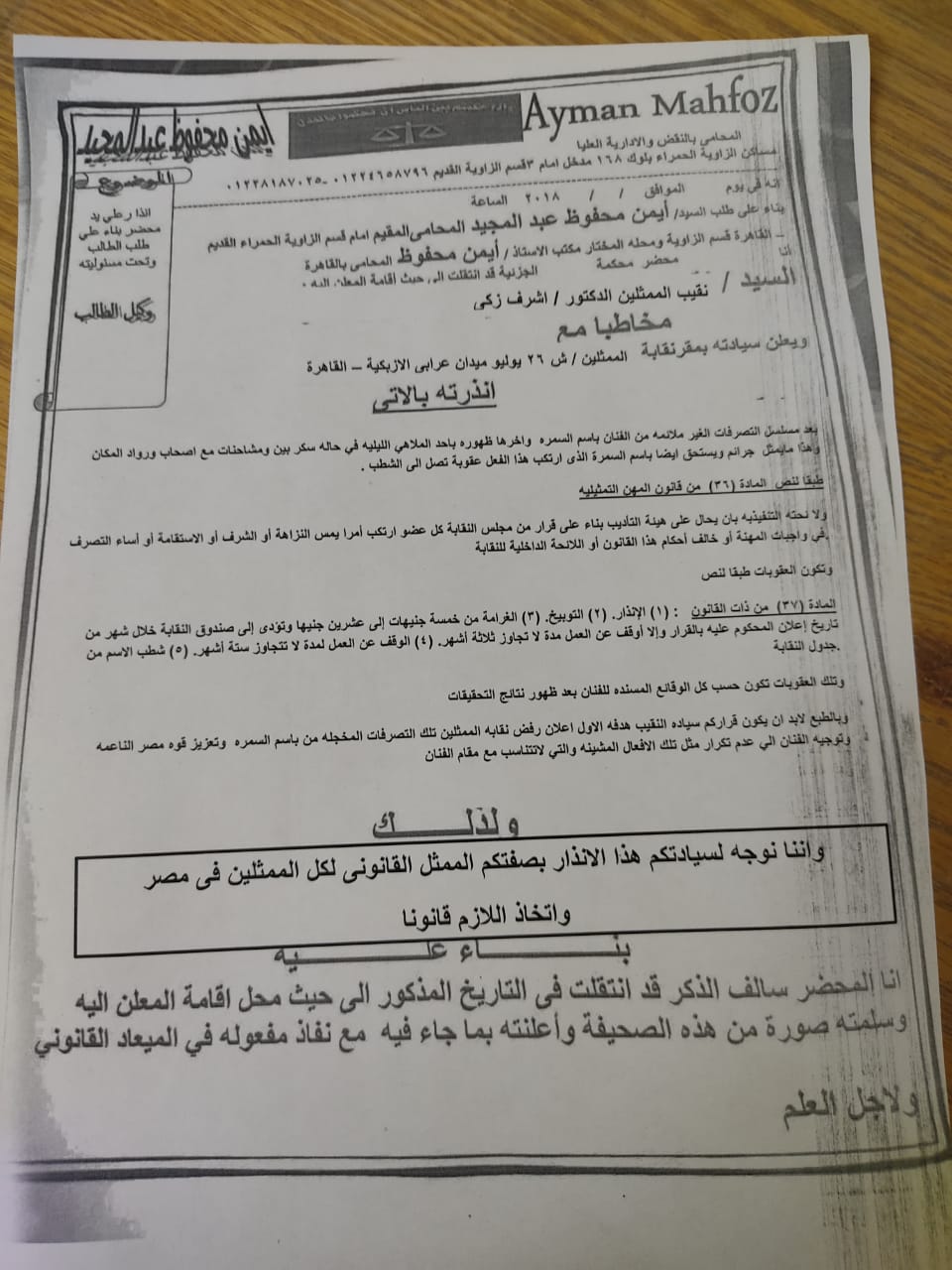 واختتم المحامي إنذاره بأننا نوجه لسيادتكم هذا الإنذار لنقيب الممثلين بصفته الممثل القانوني لكل الممثلين في مصر، للتحقيق في الواقعة المنسوب صدورها من الفنان باسم سمرة، وتوقيع العقوبة الملائمة واتخاذ اللازم قانونا.