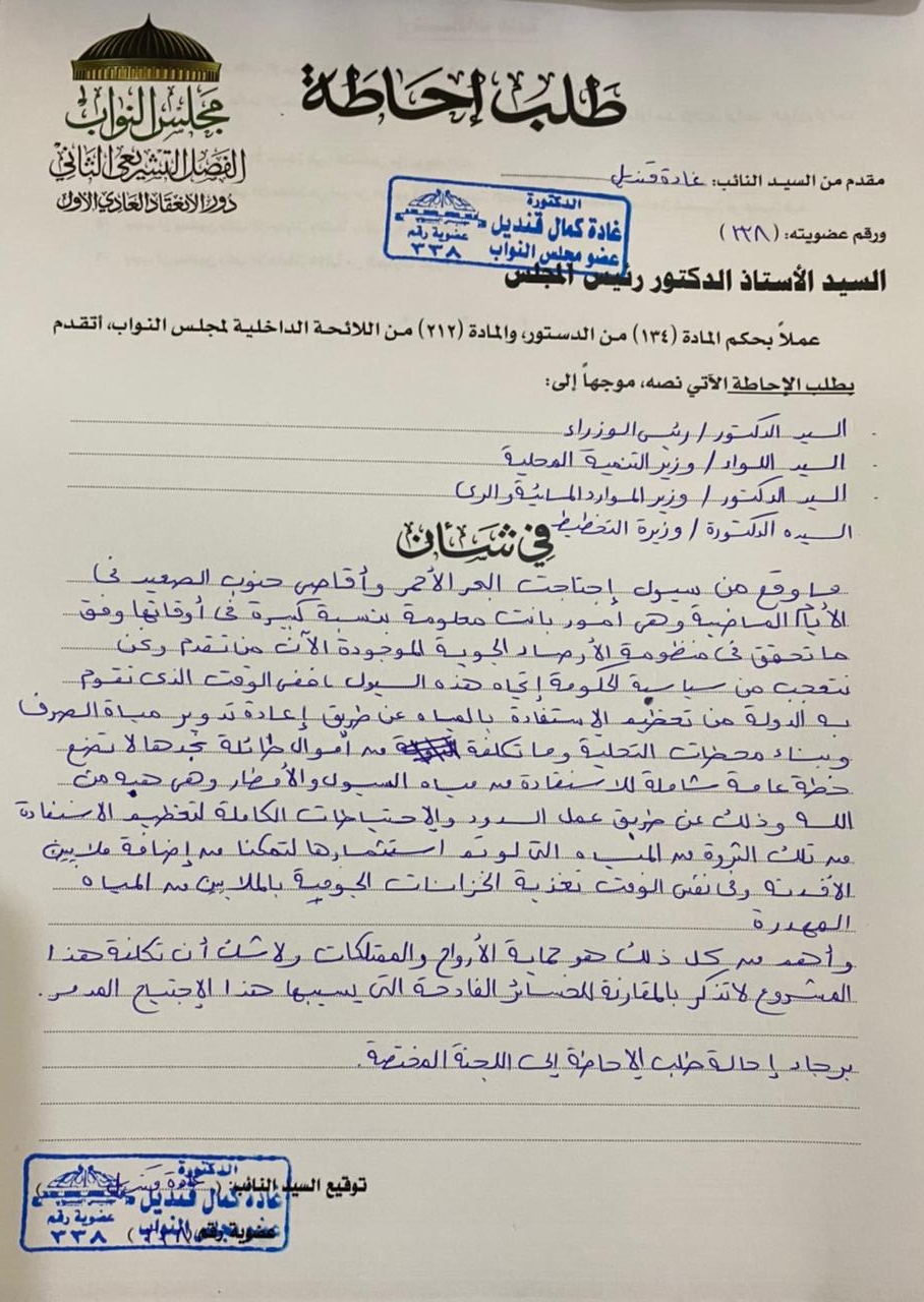 أعلنت الدكتورة غادة قنديل، عضو مجلس النواب، تقدمها بطلب إحاطة بشأن عدم استغلال الحكومة لمياه الأمطار والسيول، خاصة مع موجة الطقس السيئ التي أصابت محافظة أسوان وبعض محافظات الوجه القبلي وجبال البحر الأحمر، على الرغم من المعرفة المسبقة بتلك السيول؛ نظرا لامتلاك الدولة هيئة متميزة للأرصاد الجوية.