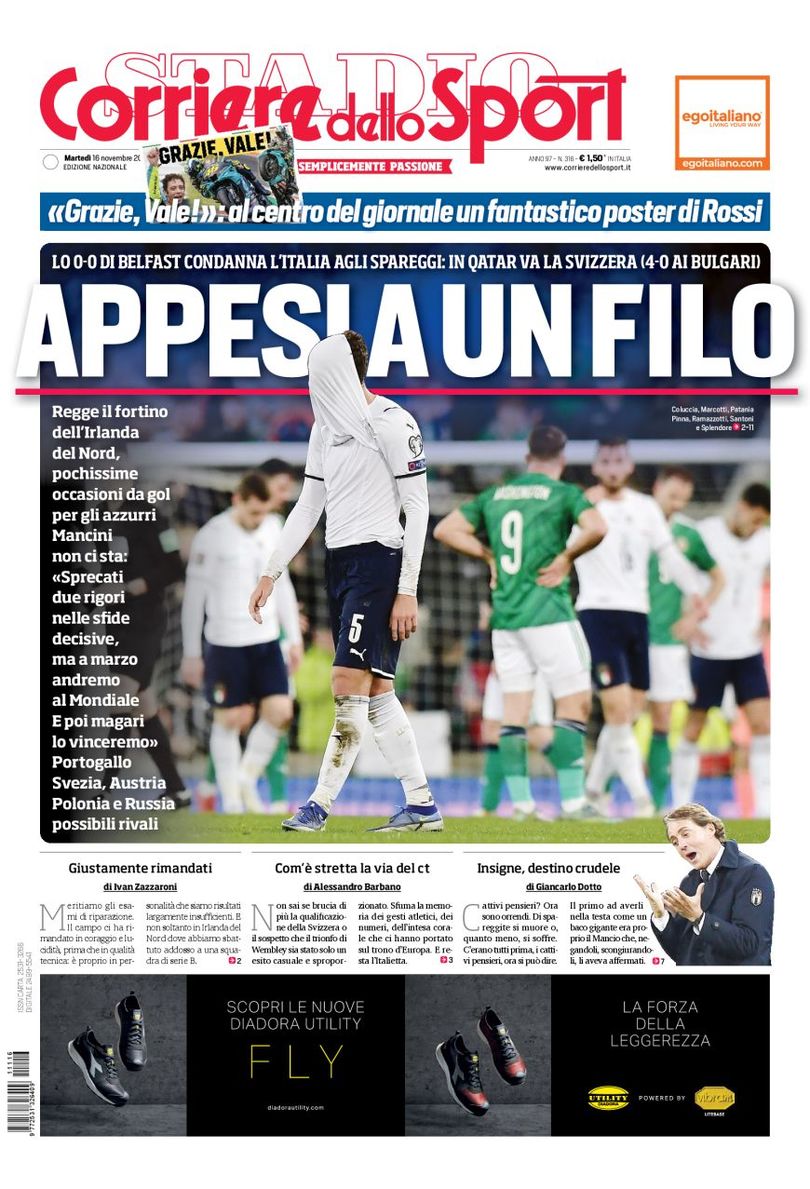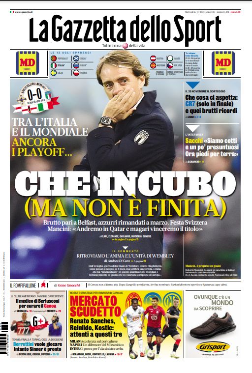 سلطت الصحيفة الضوء على فشل تأهل إيطاليا للمونديال وانتظارها خوض منافسات الملحق الأوروبي، وذلك تحت عنوان: يا له من كابوس لكن لم تنتهِ بعد... هناك ملحق بين إيطاليا وكأس العالم.