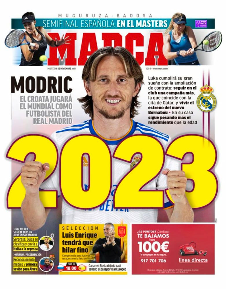 تصدر العنوان مودريتش 2023، غلاف صحيفة ماركا الإسبانية، وذلك في إشارة إلى أنه سيتم تجديد عقد مودريتش عام إضافي، سيشارك في كأس العالم في قطر ثم سيتم تحقيق حلمه باللعب في البرنابيو الجديد.