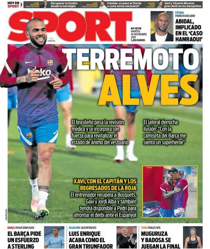 تصدر النجم البرازيلي داني ألفيس غلاف صحيفة سبورت الإسبانية لعدد اليوم، وذلك تحت عنوان زلزال ألفيس، عقب اجتيازه الفحص الطبي والمشاركة في تدريبات برشلونة.