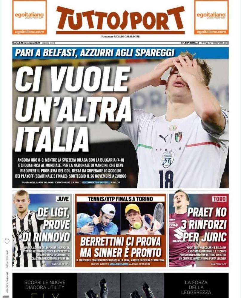 عنونت توتو سبورت في صفحة غلافها لعدد اليوم، بالعنوان: نريد إيطاليا مختلفة.. تعادل في بلفاست، الأزوري في الملحق.