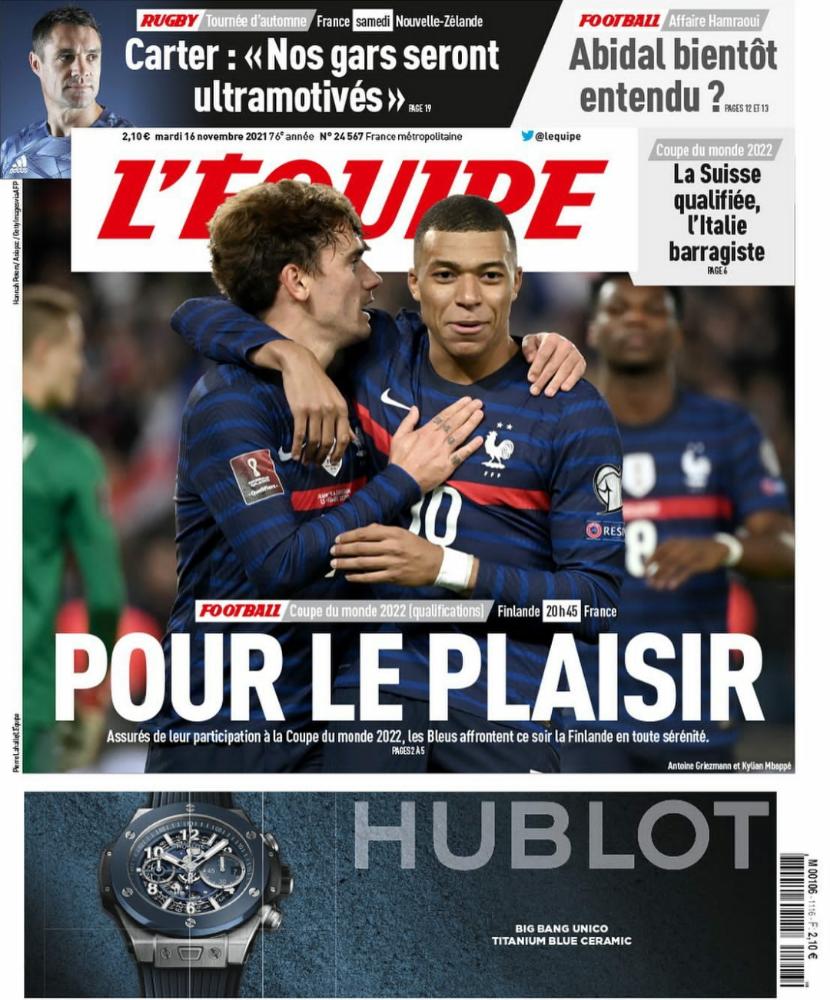تصدر العنوان من أجل المتعة، غلاف صحيفة ليكيب الفرنسية عن عدد اليوم، وذلك مع تأكد تأهل فرنسا لكأس العالم قطر 2022 وخوض لقاء فنلندا الليلة بكل هدوء.