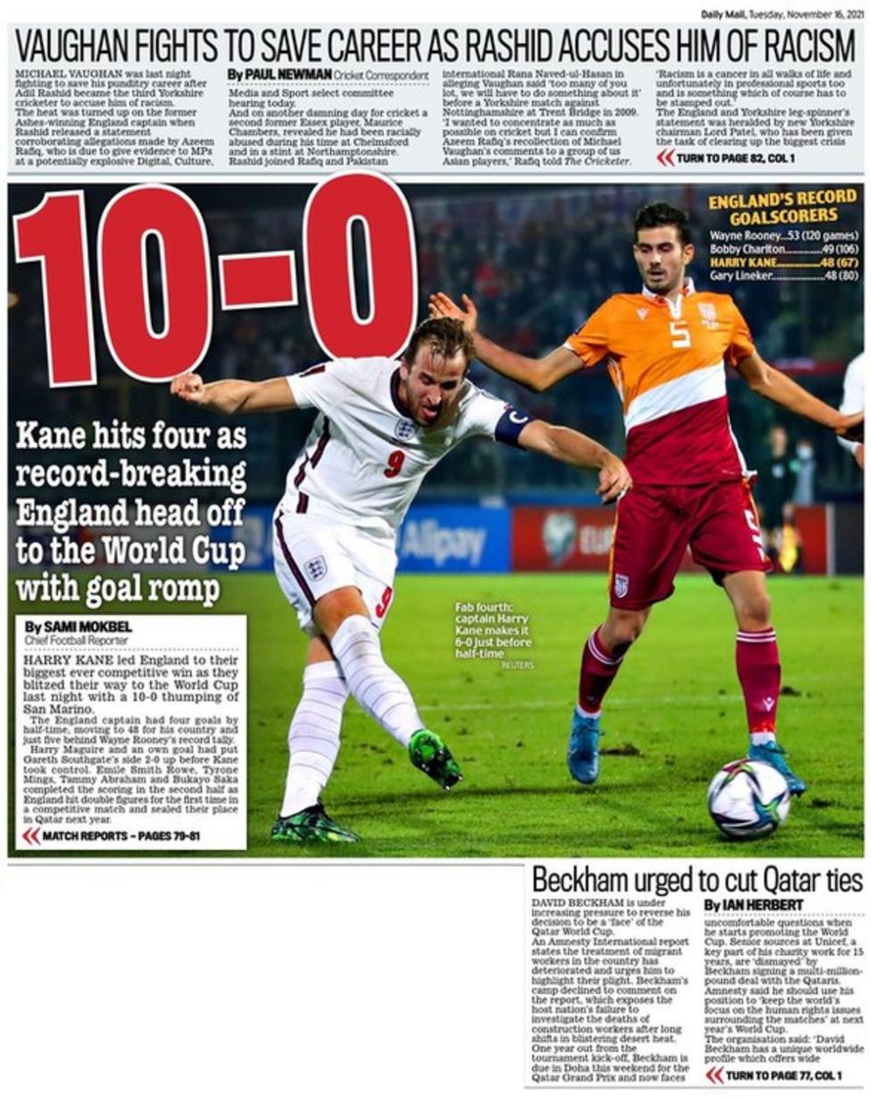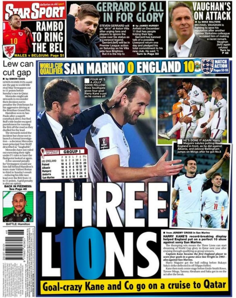 تصدر هاري كين نجم فريق توتنهام وهداف منتخب إنجلترا غلاف الصحيفة، وذلك تحت عنوان رباعية لكين.. إنجلترا تسجل 10 أهداف وتحجز مقعدًا في المونديال بمباراة مليئة بالأرقام القياسية.