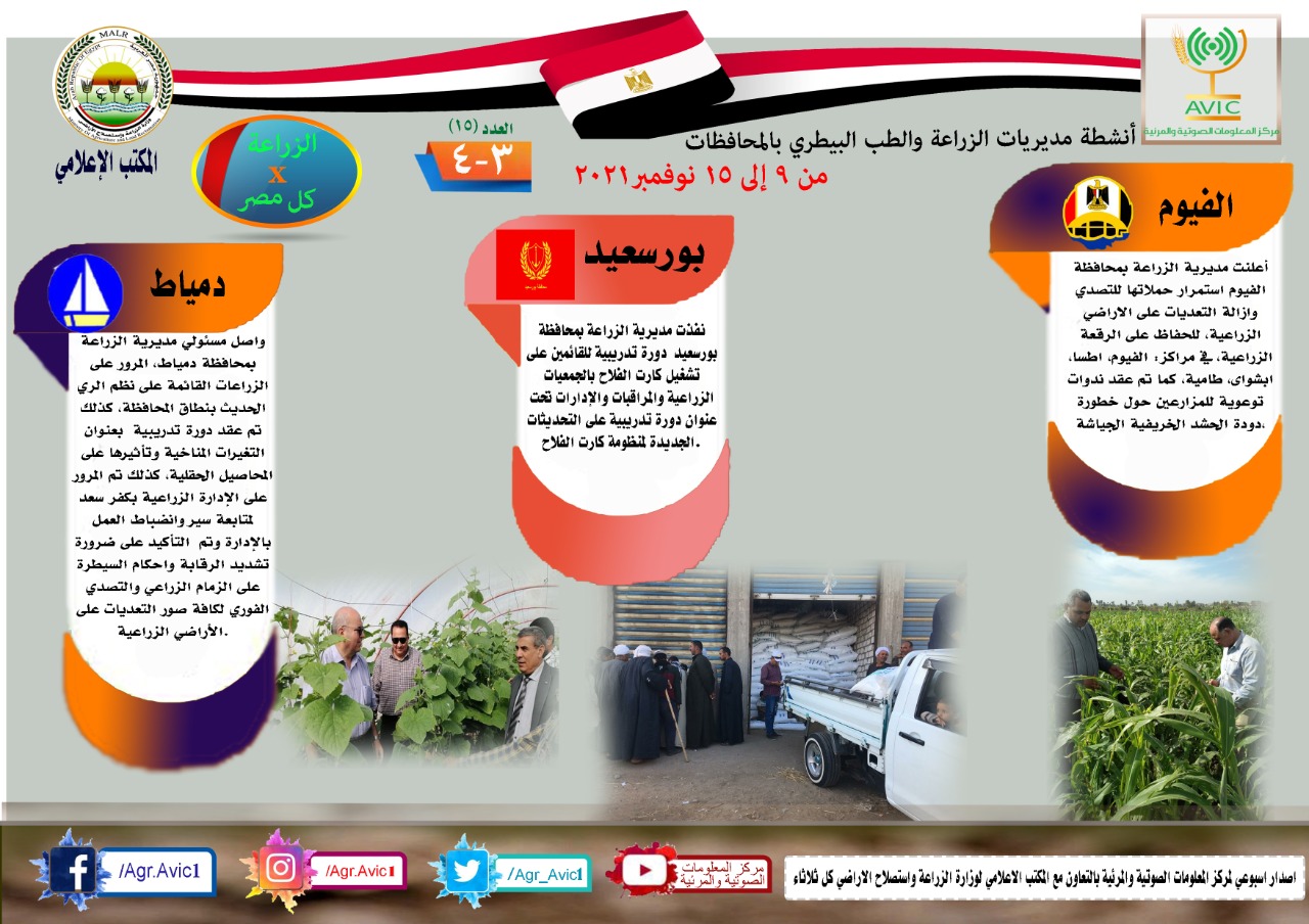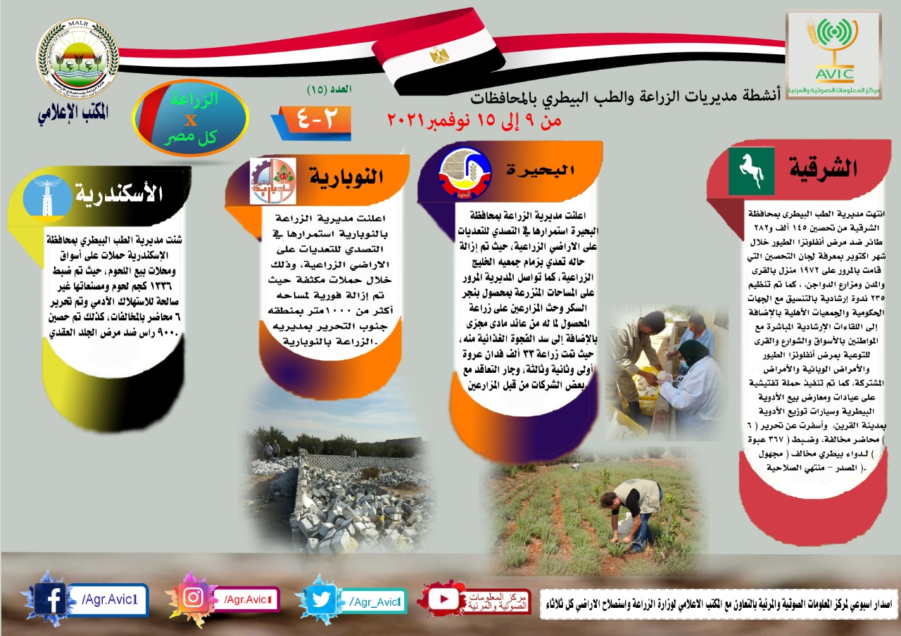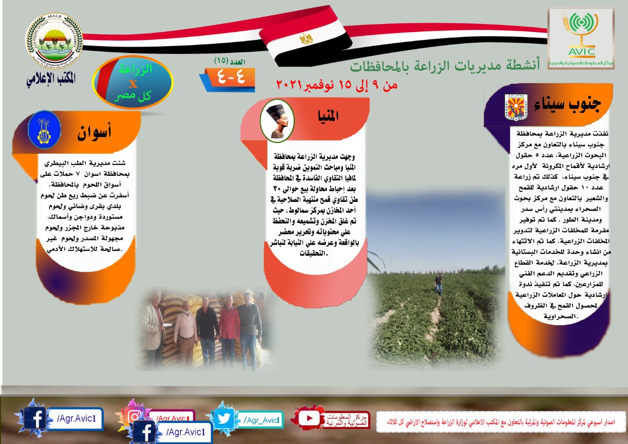 أصدر مركز المعلومات الصوتية والمرئية التابع لوزارة الزراعة واستصلاح الأراضي، والمكتب الإعلامي للوزارة، العدد رقم 15 من اصدار: "الزراعة في كل مصر" بالإنفوجراف، يوضح الجهود والأنشطة التي تقوم بها مديريات الزراعة والطب البيطري بمحافظات الجمهورية خلال الفترة من 9 إلى 15 نوفمبر الجاري الجاري.