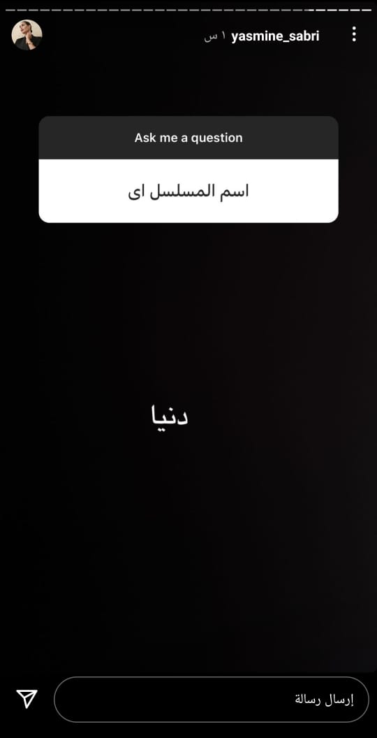 ونشرت ياسمين صبري ستوري، عبر حسابها الشخصي بموقع تبادل الصور والفيديوهات القصيرة انستجرام، ردت فيها على عدة أسئلة من جمهورها ومتابعيها، حيث تلقت سؤالا عن اسم مسلسها المقبل، لترد الأخيرة قائلة: دنيا