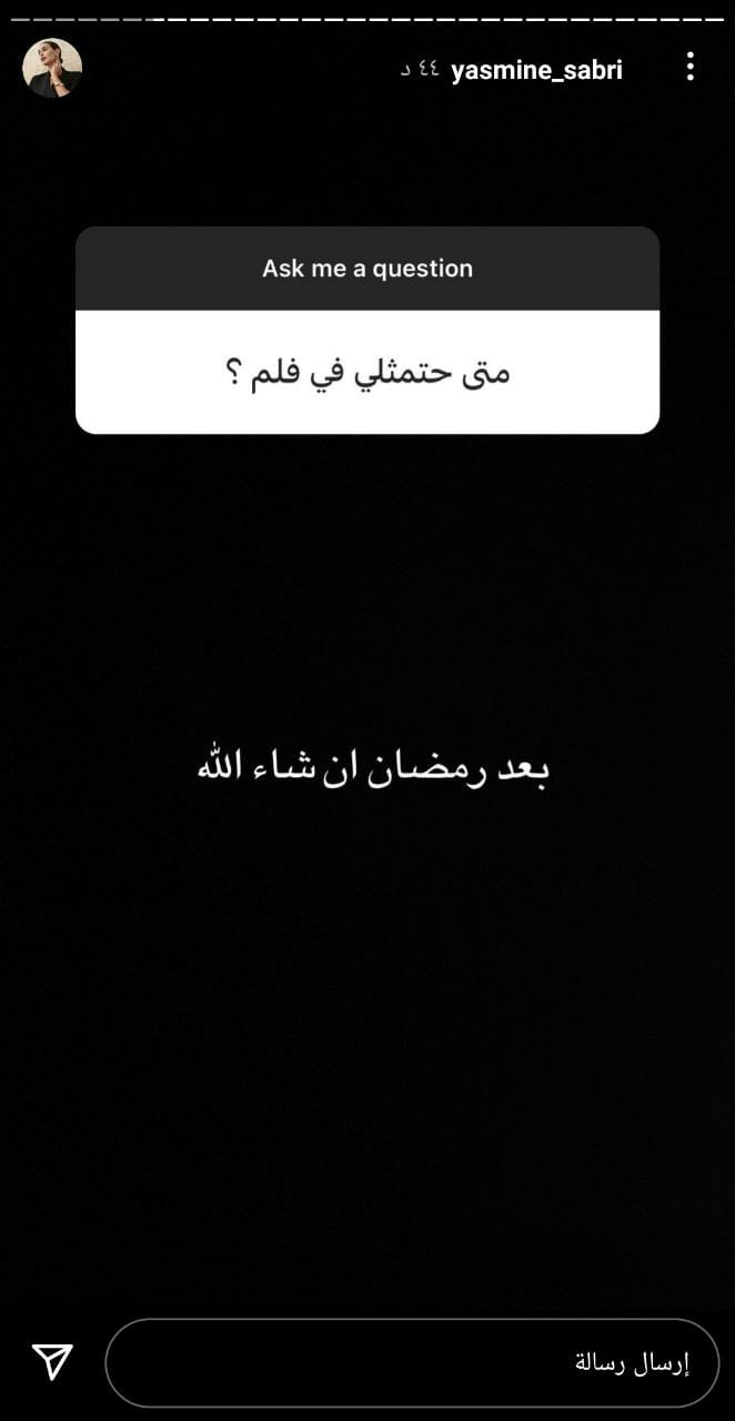 كما ردت ياسمين صبري على سؤال، متى تعود لتمثيل فيلم سينمائي، قائلة: “بعد رمضان إن شاء الله”، ولم تكشف أي تفاصيل حول نوعية هذا العمل، مشوقة جمهورها له، ومتمنية أن ينال إعجابهم.