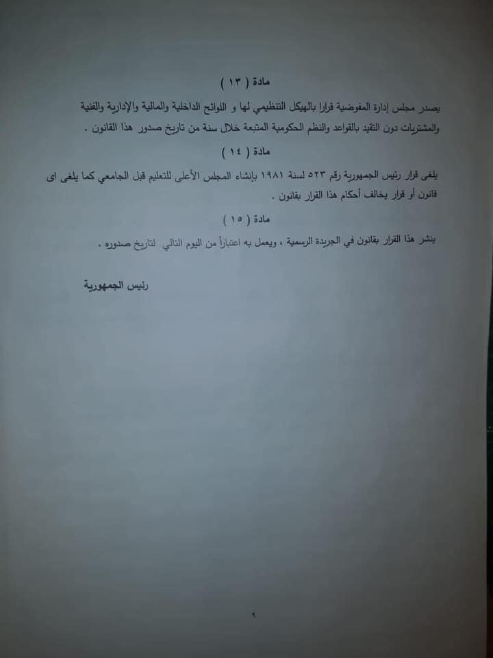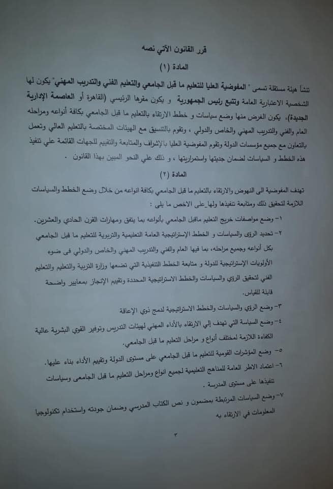 وينص القانون على أن تنشأ هيئة مستقلة تسمى المفوضية العليا للتعليم ما قبل الجامعي والتعليم الفني والتدريب المهني، يكون لها الشخصية الاعتبارية العامة وتتبع رئيس الجمهورية ويكون مقرها الرئيسي القاهرة أو العاصمة الإدارية الجديدة.