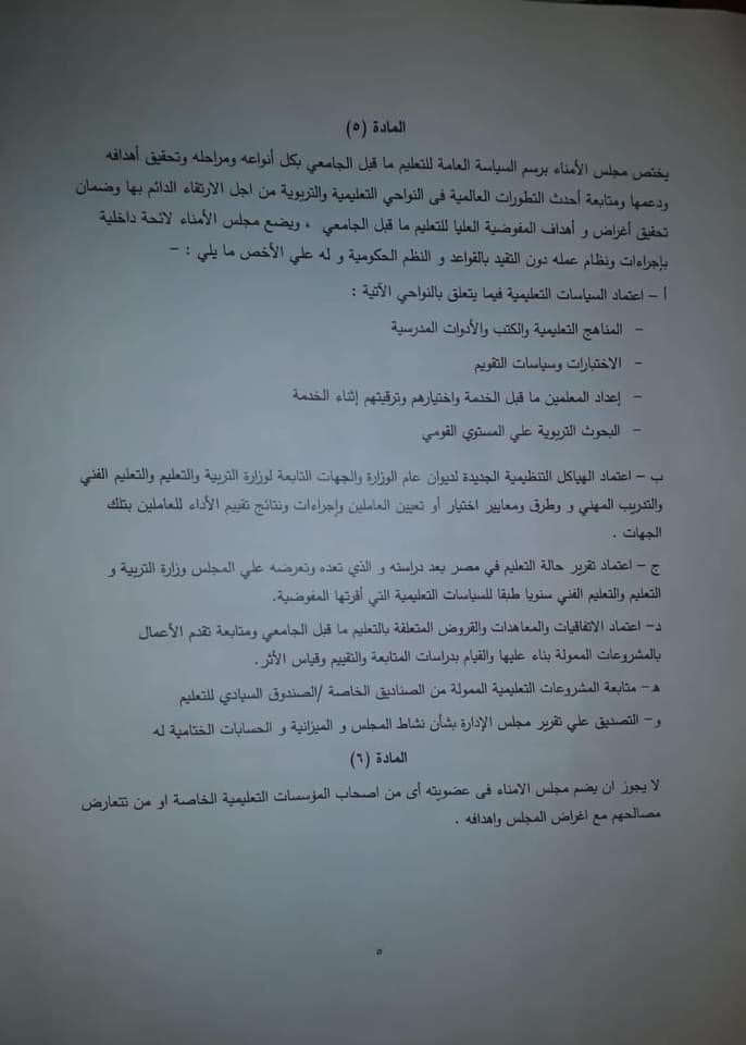 كما تستهدف تحديد الرؤى والسياسات والخطط الاستراتيجية العامة التعليمية والتربوية للتعليم ما قبل الجامعي بكل أنواعه وجميع مراحله، بما فيها العام والفني والتدريب المهني والخاص والدولي في ضوء الأولويات الاستراتيجية للدولة ومتابعة الخطط التنفيذية التي تضعها وزارة التربية والتعليم والتعليم الفني لتحقيق الرؤى والسياسات والخطط الاستراتيجية المحددة وتقييم الإنجاز بمعايير واضحة قابلة للقياس.