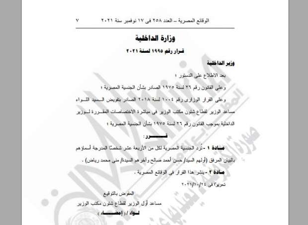 وجاء في الجريدة الرسمية أنه بعد الاطلاع على الدستور وعلى القانون القرار رقم 1995 لسنة 2021 الصادر بشأن الجنسية المصرية، وتفويض اللواء مساعد الوزير لقطاع شئون مكتب الوزير في مباشرة الاختصاص المقررة لوزير الداخلية بموجب القانون رقم 26 بشأن الجنسية المصرية.