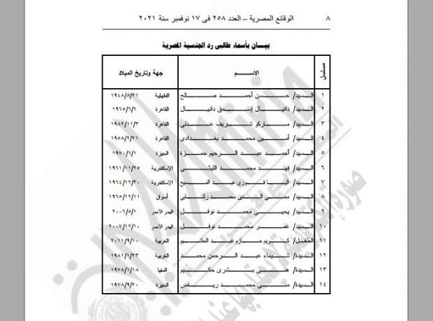 وأصدَرت وزارة الداخلية القرار رقم 1995 لسنة 2021، الذي سمح لـ14 مواطنا برد الجنسية المصرية لهم.