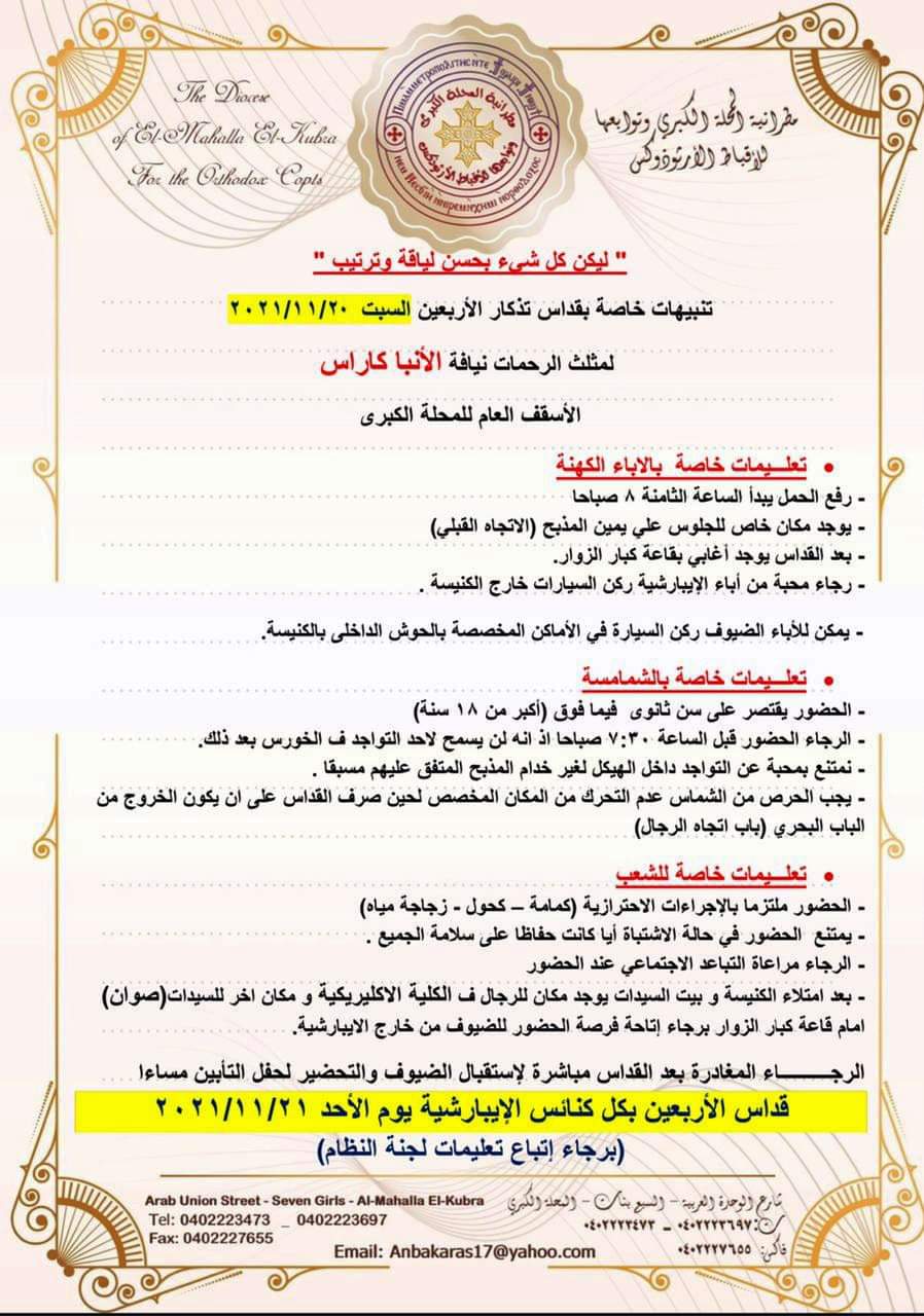أصدرت الكنيسة القبطية الأرثوذكسية اليوم، تنبيهات جديدة بشان قداس الأربعين للراحل الأنبا كاراس، الأسقف العام للمحلة الكبرى التي تبدأ يوم 20 نوفمبر 2021 في مطرانية المحلة الكبرى.