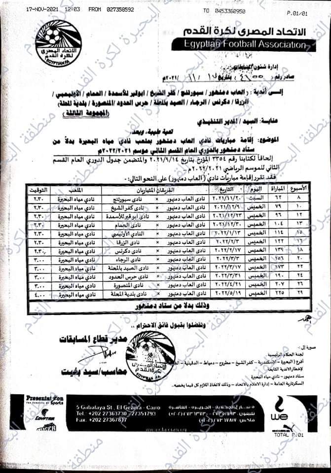 وأخطرت لجنة المسابقات بدوري الدرجة الثانية برئاسة خالد كامل أندية المجموعة الثالثة، التي ستواجه فريق ألعاب دمنهور بتغير ملعب الفريق من استاد دمنهور إلى ملعب مياه البحيرة.