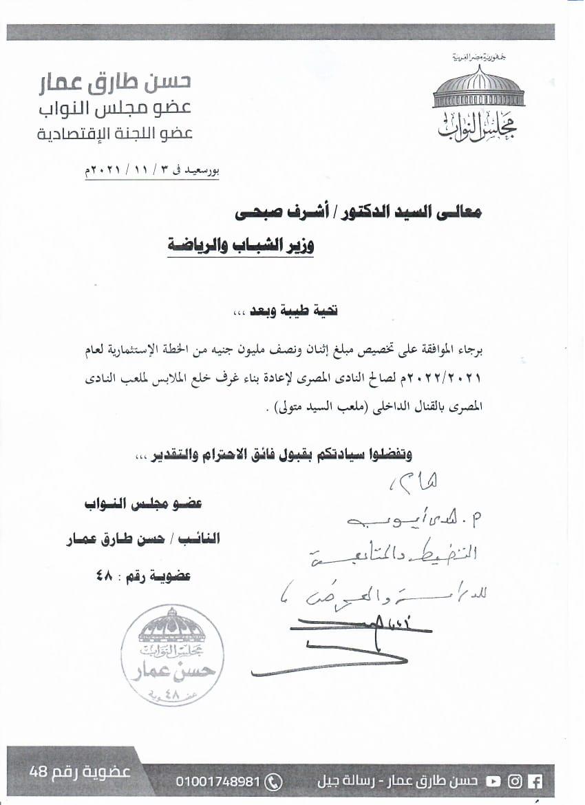 وافق الدكتور أشرف صبحي وزير الشباب والرياضة، على الطلب المقدم من النائب حسن طارق عمار، بشأن تخصيص مبلغ اثنان ونصف مليون جنيه ضمن الخطة الاستثمارية لعام 2021-2022 لصالح النادي المصري، تستخدم في تطوير وإعادة بناء غرف خلع الملابس بملعب النادي المصري بالقنال الداخلي سيد متولي.