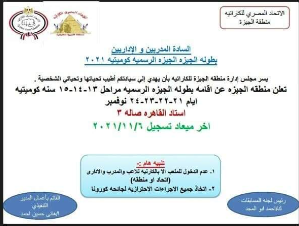 تلقت إدارة النشاط الرياضي بنادي الزمالك برئاسة الدكتور عاطف النمر، خطابا من الاتحاد المصري للكاراتيه، يفيد بمواعيد بطولة الجيزة الرسمية: كوميتيه.