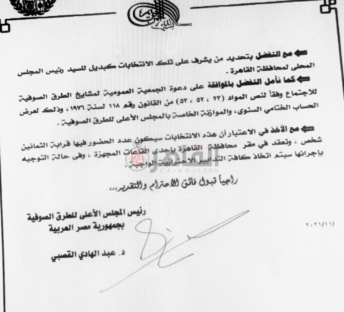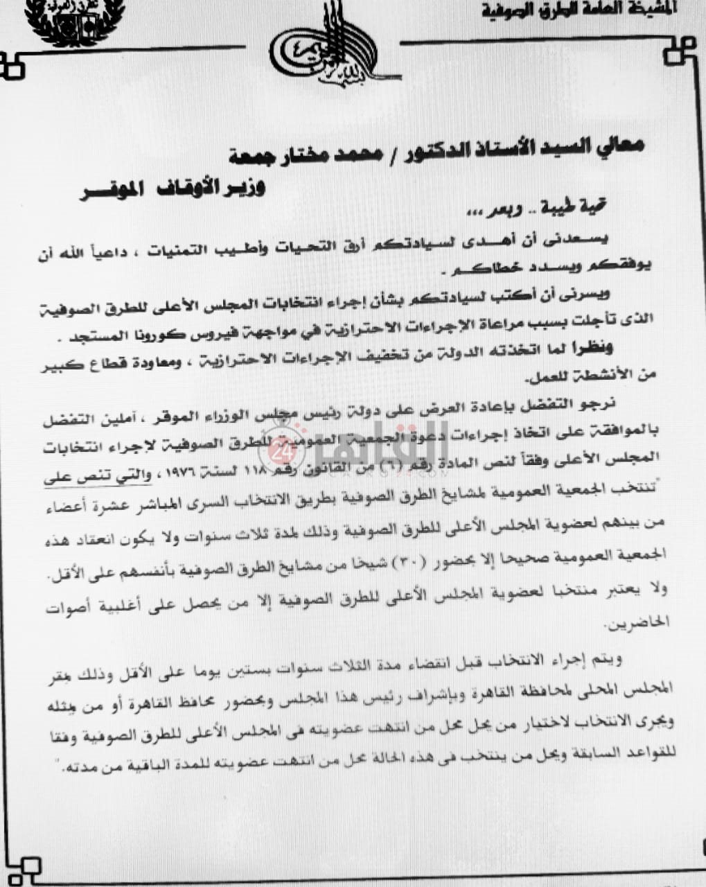 وقال رئيس المجلس الأعلى للطرق الصوفية، في الطلب الذي تقدم به، وحصل القاهرة 24 على نسخة منه: اكتب لسيادتكم بشأن إجراءات انتخابات المجلس الأعلى للطرق الصوفية الذي تأجلت بسبب مراعاة الإجراءات الاحترازية ومعاودة قطاع كبير من الأنشطة للعمل.