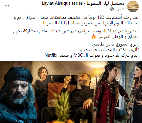 وكتبت أدمن صفحة مسلسل ليلة السقوط، منشورًا، جاء فيه: بعد رحلة استغرقت 122 يومًا، في مختلف محافظات شمال العراق، تم وبحمد ﷲ اليوم الانتهاء من تصوير مسلسل ليلة السقوط.
