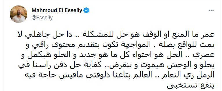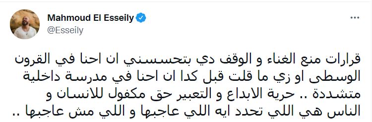 فيما عبّر المطرب محمود العسيلي عن غضبه من القرار، وكتب عبر تويتر، أن ذلك يجعله يشعر بأنه كما لو كان في القرون الوسطى أو في مدرسة داخلية متشددة، مشيرا إلى أن المنع ليس حلا، وهناك حرية للإبداع والتعبير، وذلك حق مكفول للإنسان.