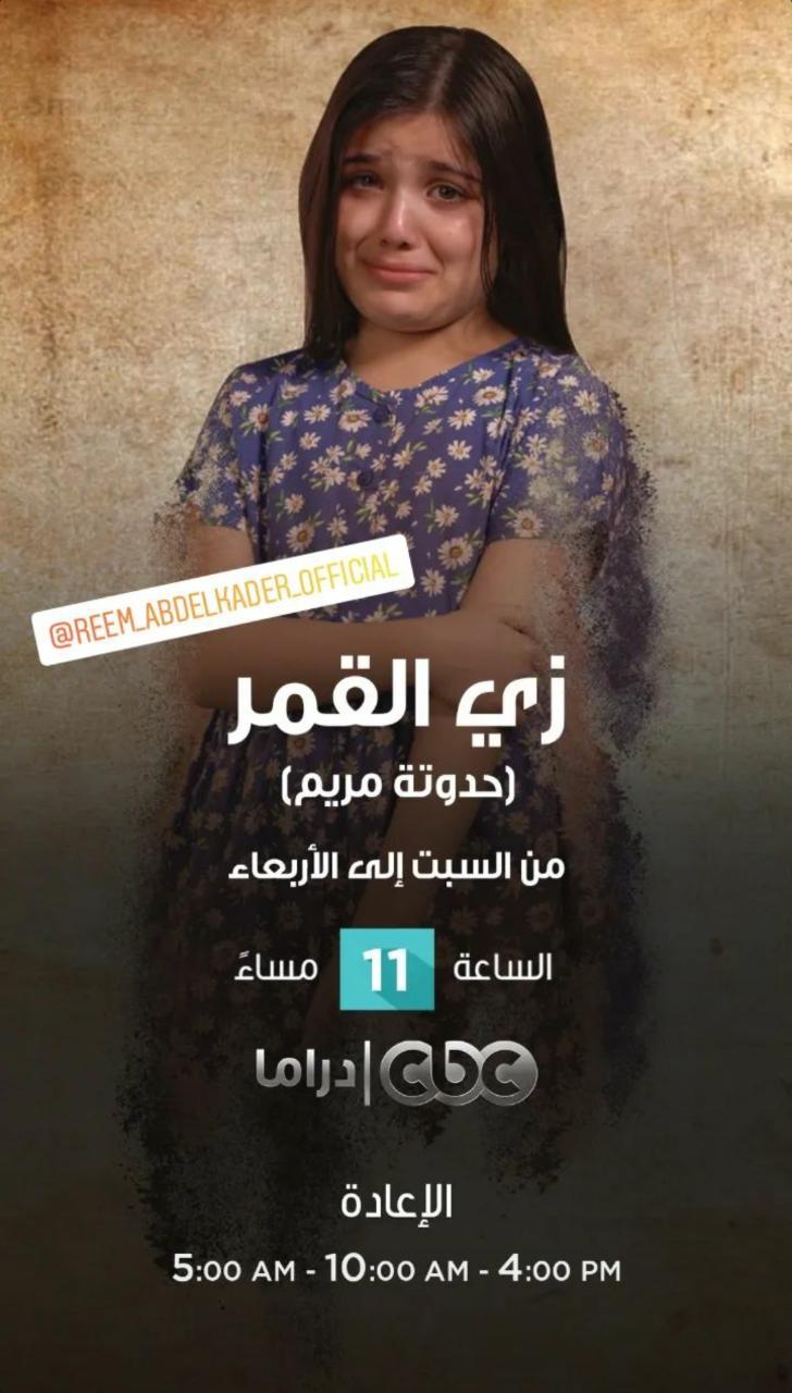 تستعد الطفلة الموهوبة ريم عبد القادر لعرض أولى حلقات حكاية مريم إحدى حكايات مسلسل زي القمر، اليوم السبت، على شاشة قنوات cbc.