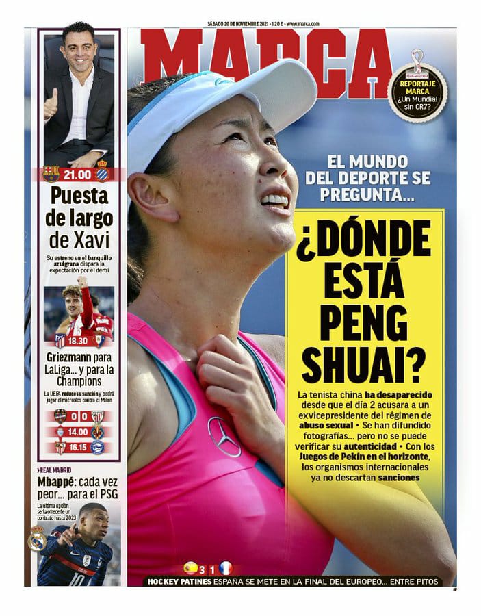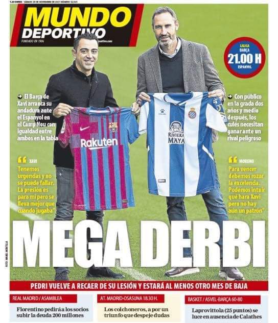 جاء في غلاف صحيفة موندو ديبورتيفو الإسبانية اليوم، يبدأ برشلونة تشافي ضد إسبانيول في الكامب نو حيث يتواجه الفريقان، وذلك في إشارة منها بالاختبار الأول لتشافي في الليجا كمدرب مع برشلونة.