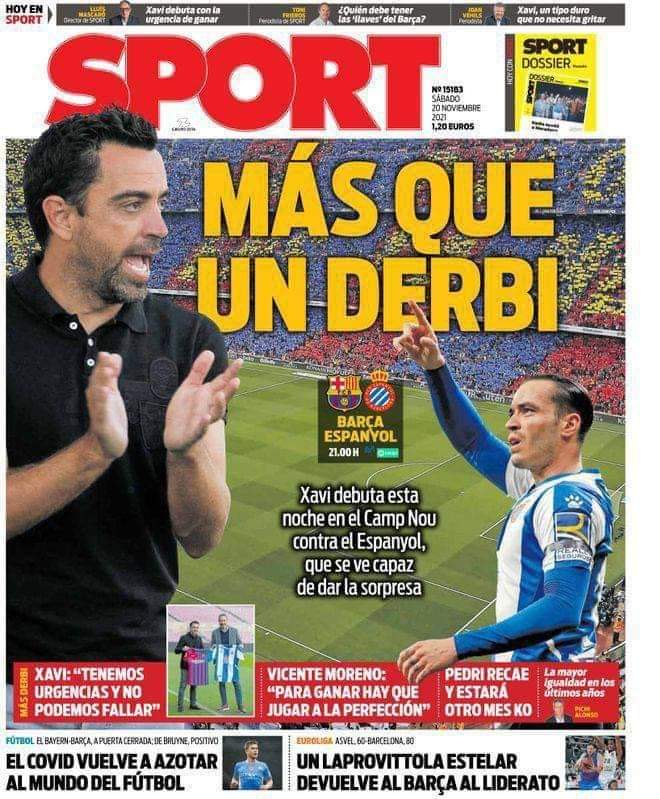 تصدر العنوان، يبدأ تشافي مبارياته مع برشلونة الليلة في الكامب نو ضد إسبانيول الذي يرى نفسه قادرًا على المفاجأة، غلاف سبورت، وذلك في إشارة للترقب الكبير من كافة الجماهير لأداء برشلونة تحت قيادة تشافي.