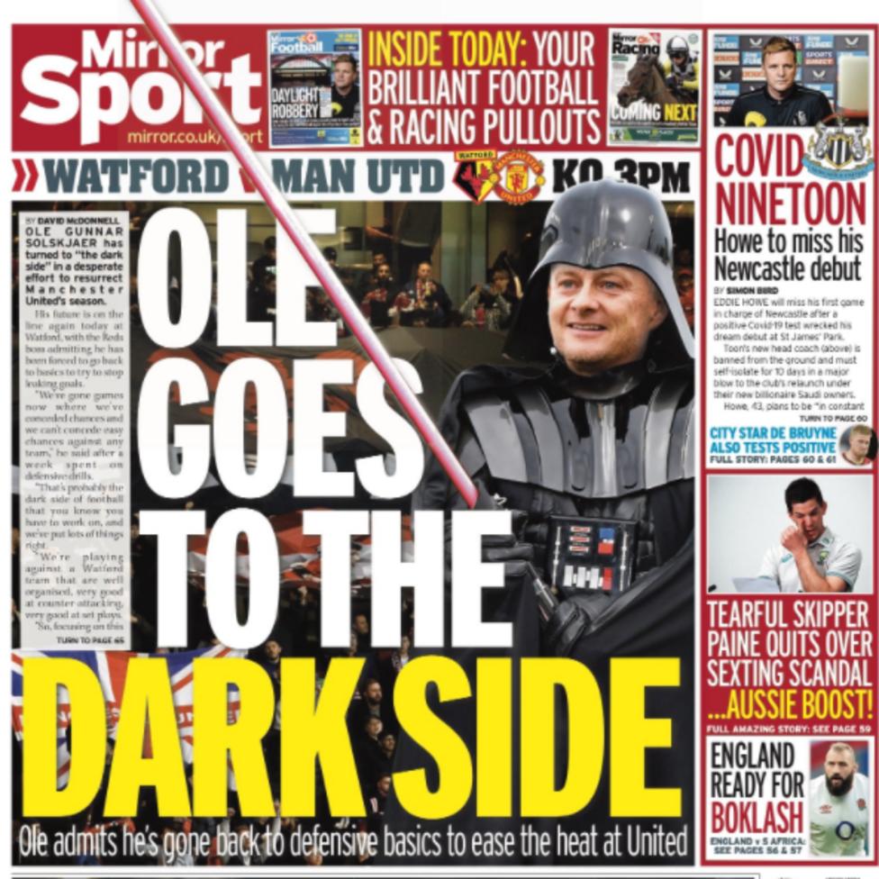 جاء في غلاف صحيفة ميرور الإنجليزية اليوم العنوان، سولشاير يتجه للجانب المظلم، وذلك في إشارة منها بأن الفترة المقبلة ستكون صعبة على النرويجي.