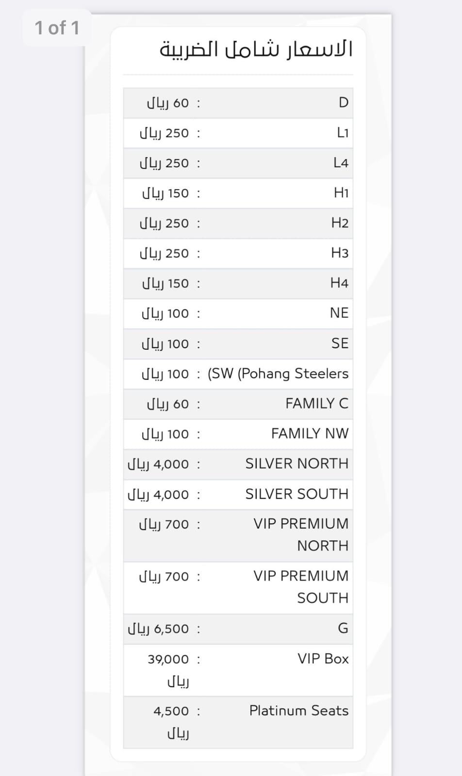 ووصل سعر تذكرة درجة الـ Vip box في النهائي الآسيوي إلى 39 ألف ريال سعودي، أي ما يوازي 163 ألف جنيه مصري، بينما بلغ سعر تذكرة درجة الـ G في المباراة 6500 ريال.