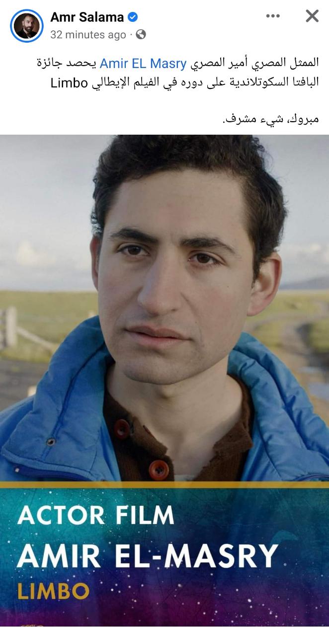 هنأ المخرج عمرو سلامة الفنان أمير المصري بعد حصوله علي جائزة البافتا - اسكتلندا، وكتب عبر حسابه بموقع تويتر: الممثل المصري أمير المصري يحصل علي جائزة البافتا السكوتلاندية علي دورة الفيلم الايطالي limbo مبروك شيء مشرف.