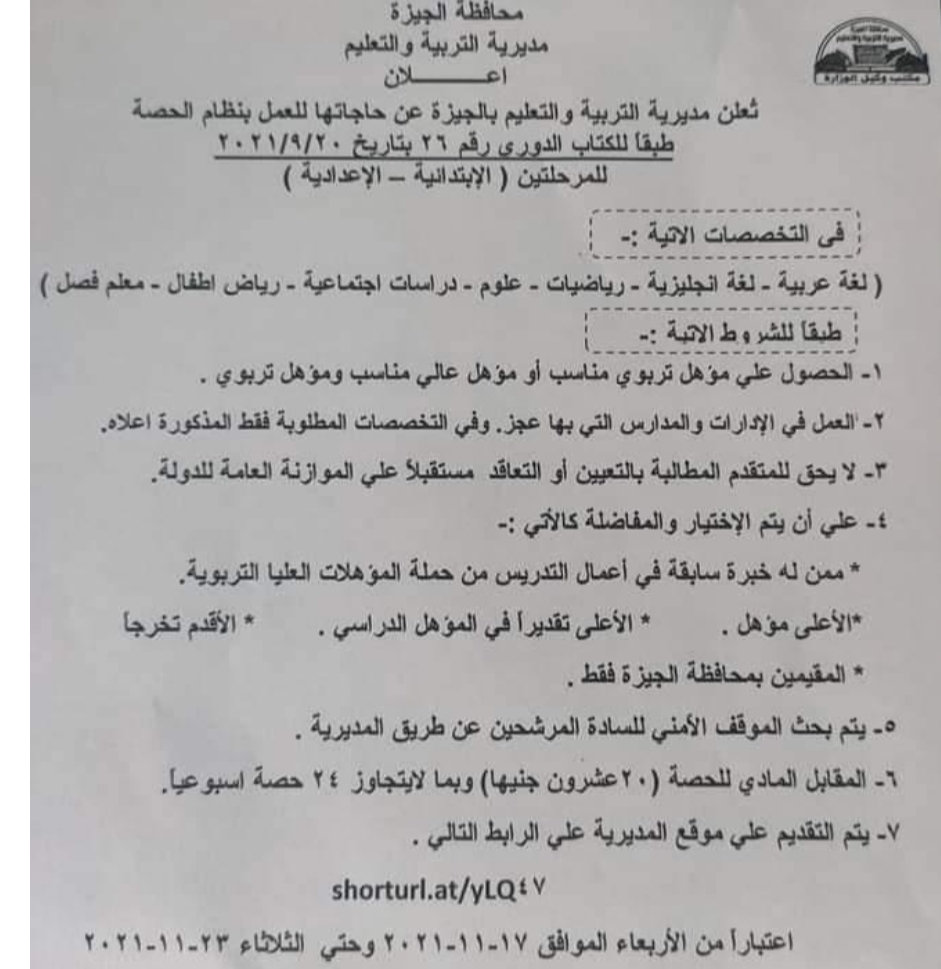 5- يتم بحث الموقف الأمني للسادة المرشحين عن طريق المديرية.- المقابل المادي للحصة عشرون جنيها فقط لا غير، وبما لا يتجاوز ال24 حصة أسبوعيًا.