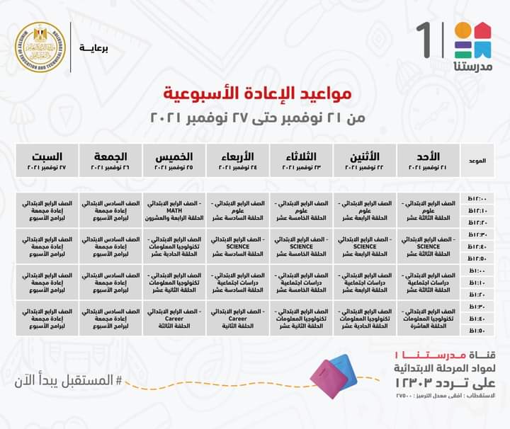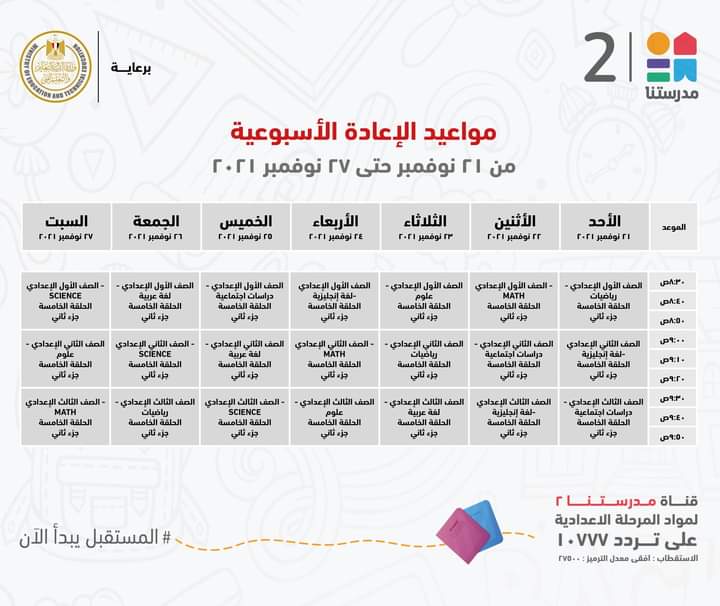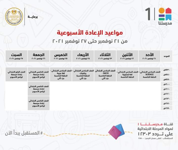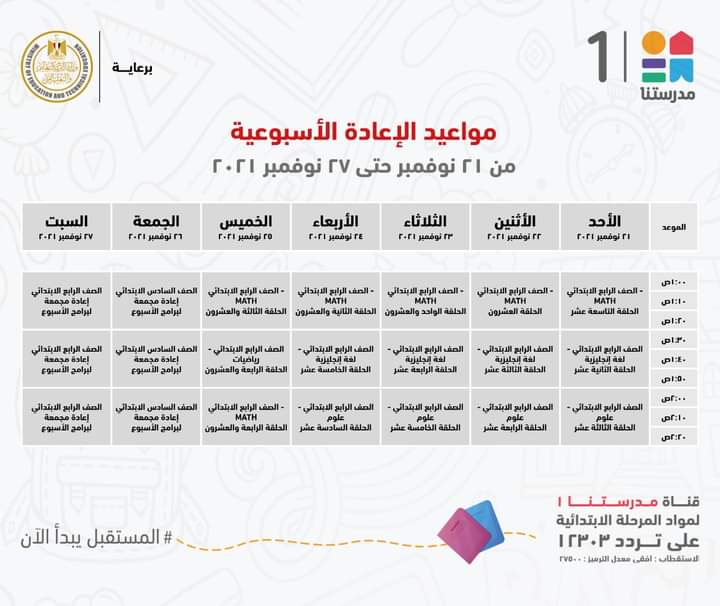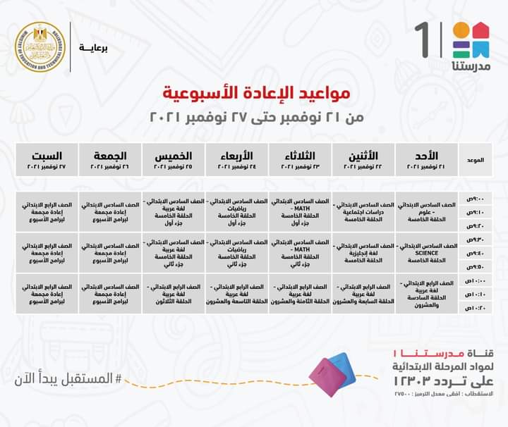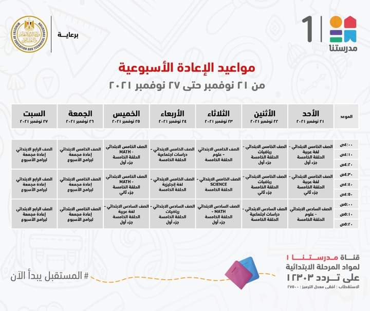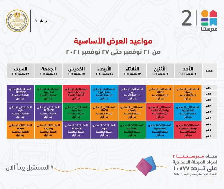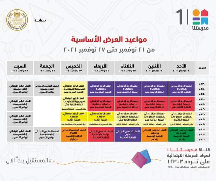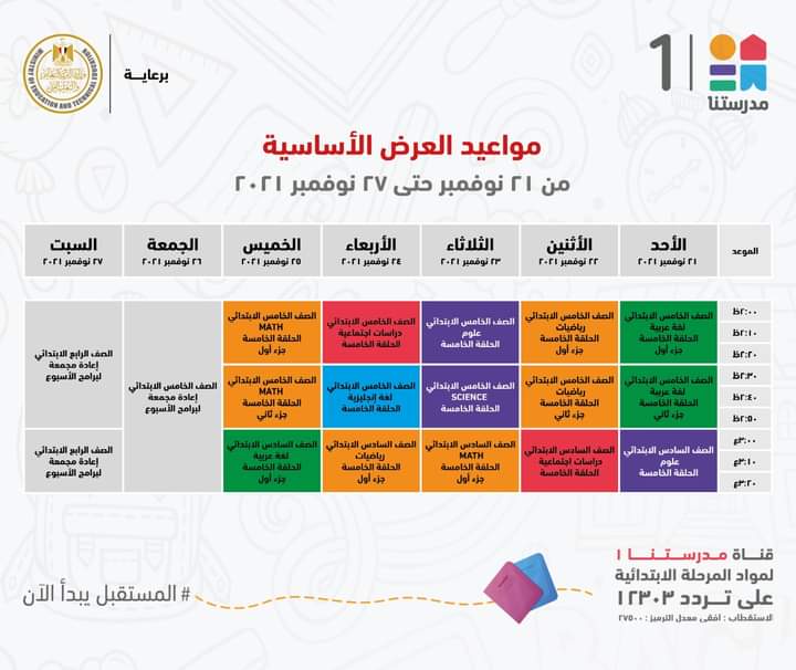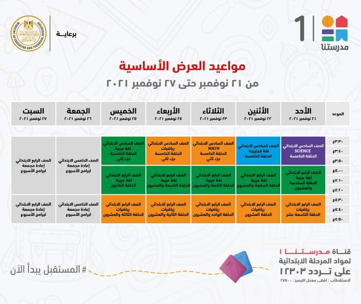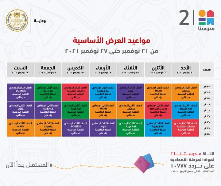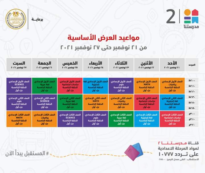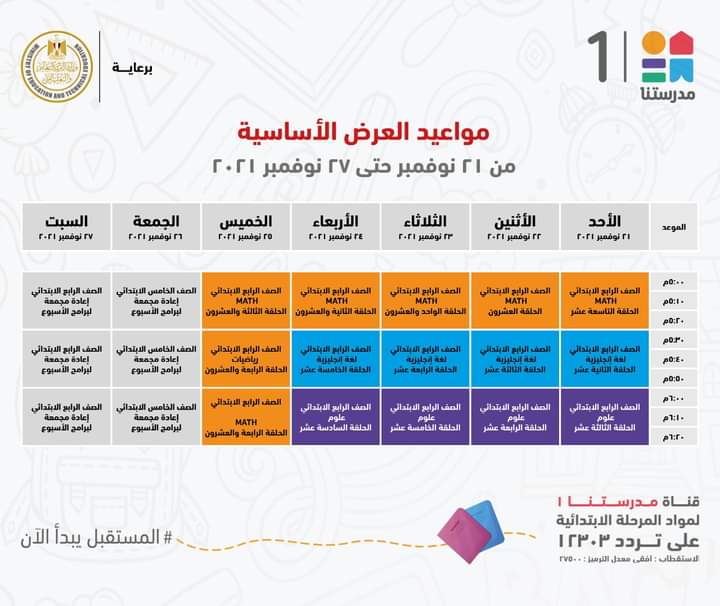 أعلنت وزارة التربية والتعليم والتعليم الفني، مواعيد عرض البرامج التعليمية للمناهج المدرسية على قناة مدرستنا 1،2 لأولياء الأمور وطلاب المرحلة الابتدائية والإعدادية.