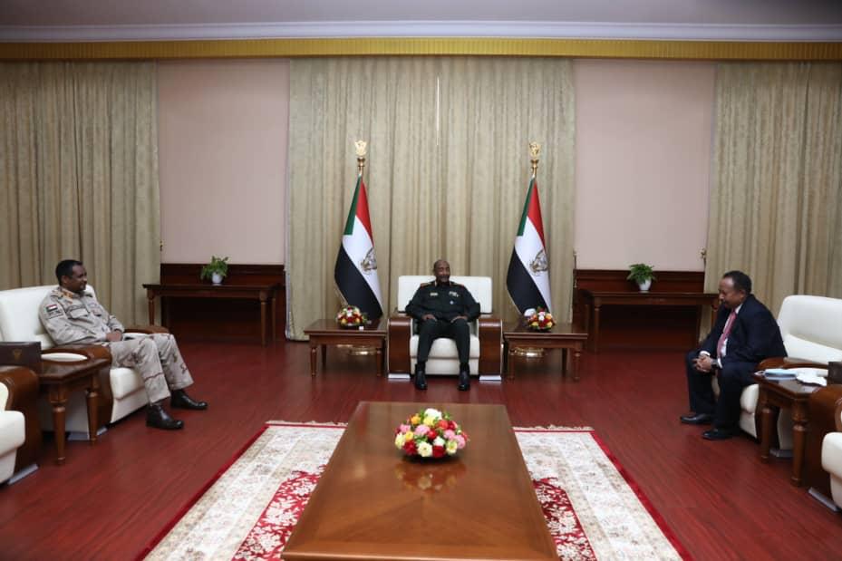 ونشرت وكالة أنباء السودان الرسمية سونا، صورة تجمع البرهان وحمدوك ومحمد حمدان دقلو حميدتي، قائد قوات الدعم السريع ونائب رئيس مجلس السيادة، بالقصر الرئاسي اليوم.