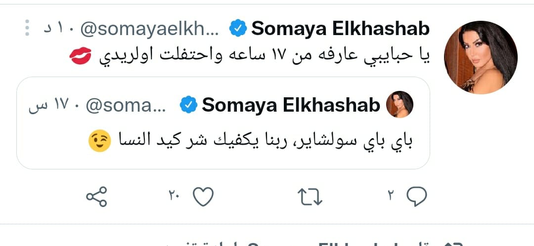 وكتبت سمية الخشاب تغريدة، عبر حسابها الشخصي بموقع التدوينات القصيرة تويتر، مغردةً عن رحيل سولشاير: يا حبايبي عارفة من 17 ساعة.. واحتفلت أوريدي.