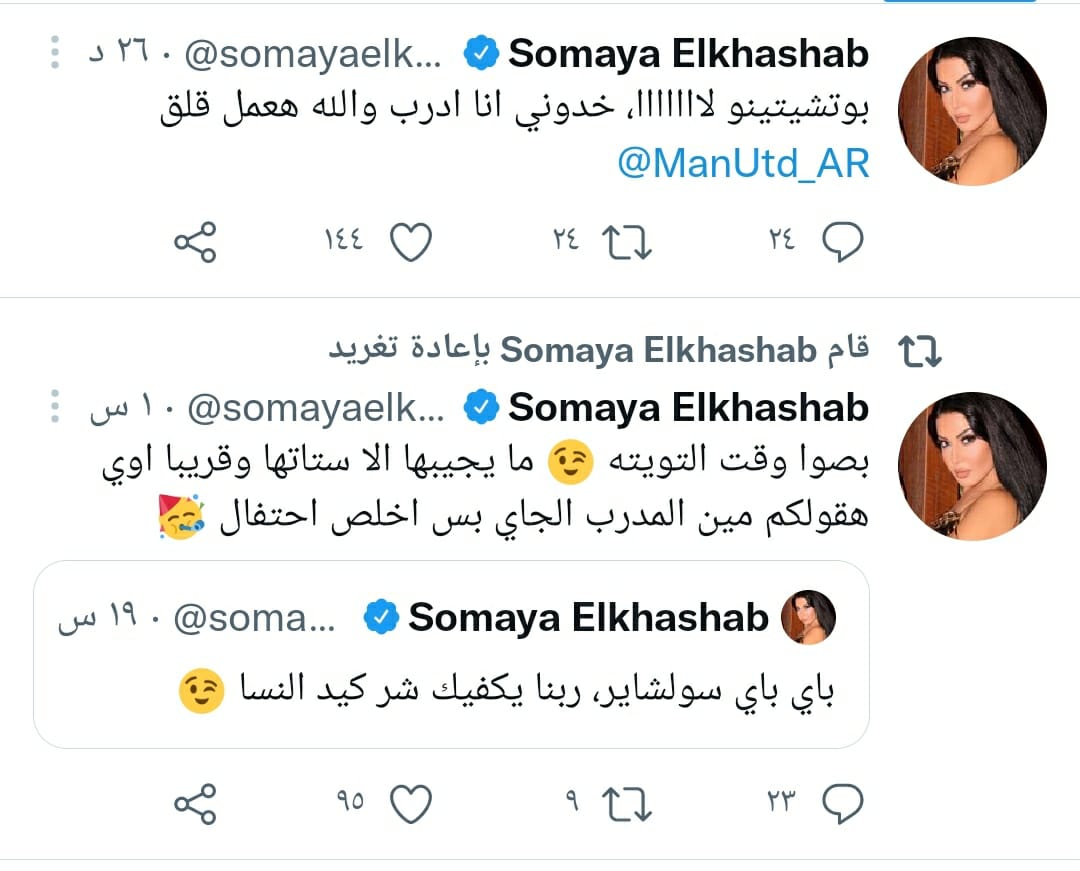 كما كتبت سمية الخشاب تغريدة أخرى، قالت فيها: بصوا وقت التويتة، ما يجيبها إلا ستاتها، وقريبًا أوي هقولكم مين المدرب الجاي، بس أخلص احتفال.