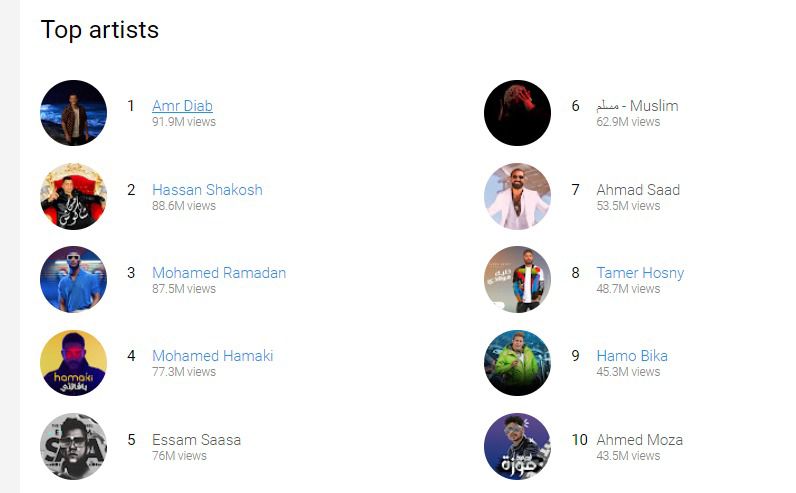 وضمت القائمة 20 اسمًا، حيث جاء في المركز الرابع حسن شاكوش، ثم ويجز في المركز الخامس، وفي المرتبة السادسة مسلم، واحتل المركز السابع محمد رمضان، والمركز الثامن لـ مسلم، وفي المرتبة التاسعة حمو التيخا، وجاء تامر حسني في المركز العاشر.