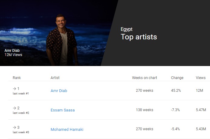 وكشف تصنيف Youtube Charts تصدُّر الهضبة عمرو دياب، قائمة الأكثر استماعًا ومشاهدة بمصر محققًا 12 مليون مشاهدة في أسبوع واحد فقط.