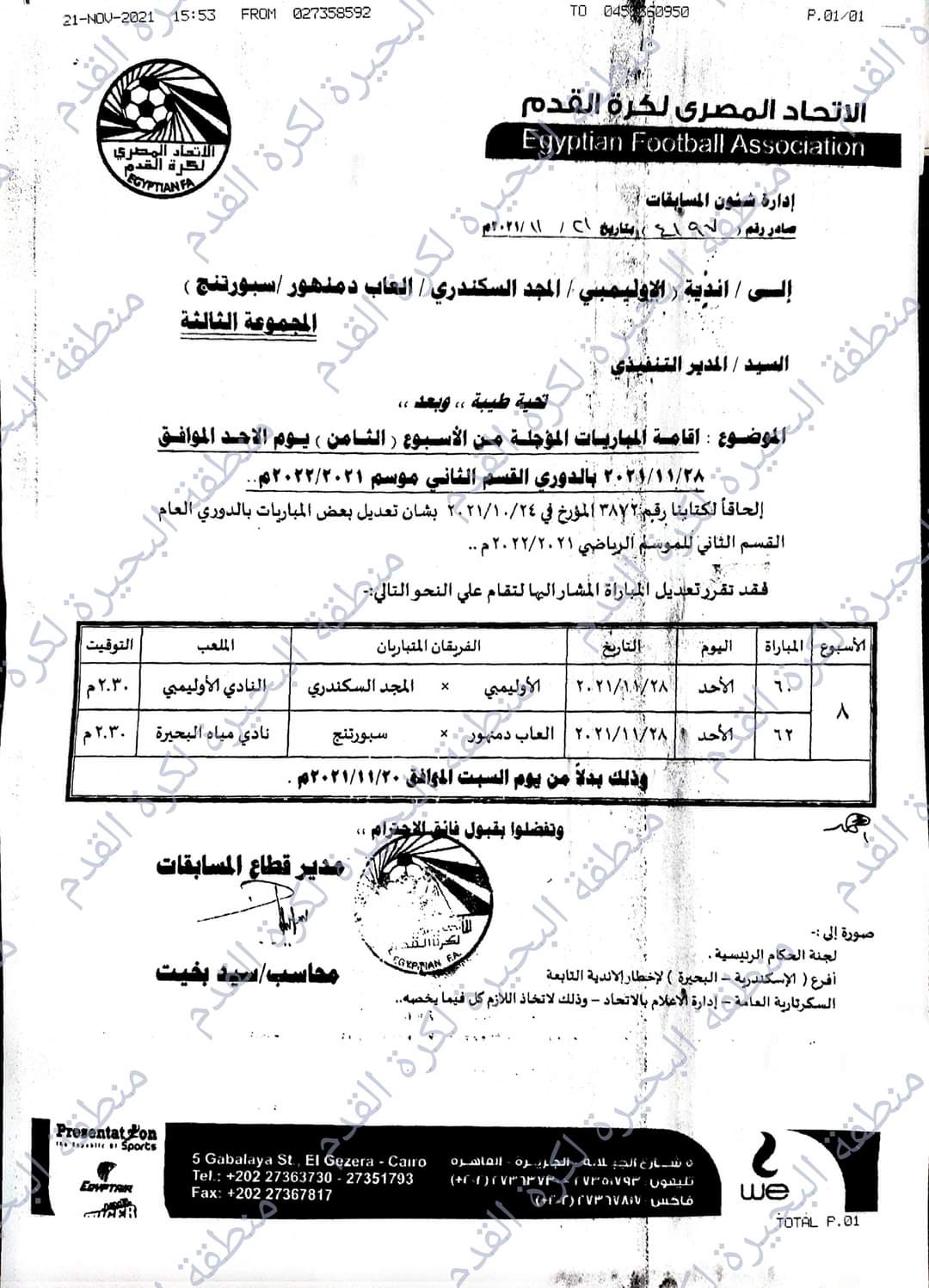 وأرسلت لجنة المسابقات إخطارًا إلى الأندية الأربعة يفيد بتحديد موعد جديد للمواجهتين المؤجلتين، والتي كان من المقرر إقامتها يوم السبت الموافق 20 نوفمبر، وإقامتهما يوم الأحد الموافق 28 نوفمبر الجاري.