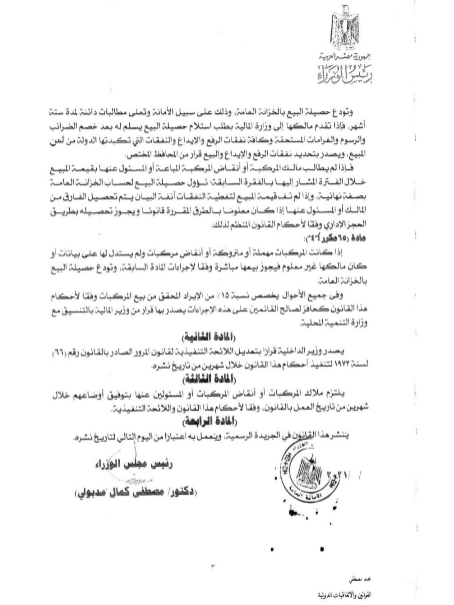 ولمالك المركبة أو أنقاض المركبة أو المسئول عن إدارتها التقدم إلى نيابة المرور المختصة لاستلام المركبة أو أنقاض المركبة خلال ستين يوما من تاريخ الإعلان بطلب يقدم مشفوعا بسند الملكية وإيصالات سداد كافة النفقات والايواء المستحق، وتسلم النيابة المختصة المركبة أو الأنقاض ما لم يكن لدي جهة المرور المختص أو المحافظة مانع قانوني.